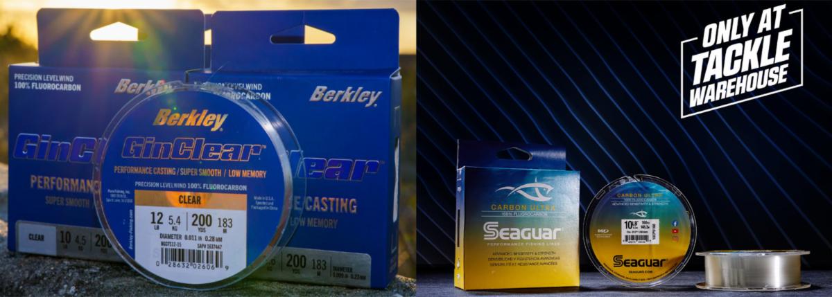 On the right, Seaguar's Tackle Warehouse exclusive Carbon Ultra Fluoro. Built with Seaguarβs Double Structure Fluorocarbon (DSF) tech β a dense core with a softer outer resin β itβs designed for thin diameter, low stretch, and high sensitivity with strong knot and abrasion resistance. MSRP runs $34.99β$50.99 on Tackle Warehouse, depending on size.