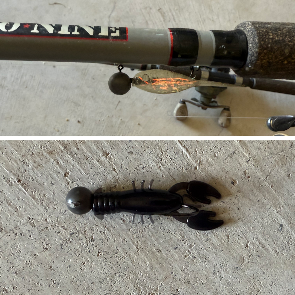 When Jerry's just dipping into cover, he's fishing a 1/8-3/16 oz jighead with no top weight so he can feel when he hits the bottom.