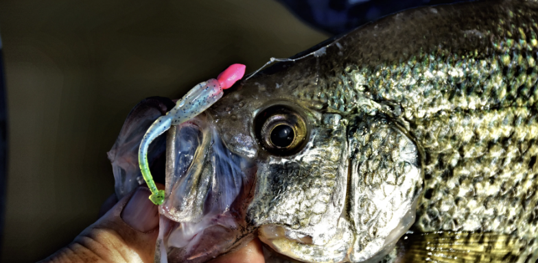 The NetBait BaitFuel Blip Minnow is another smaller paddle tail but it has a different triangular-cut tail that gives it a real tight kick instead of a wobble – perfect for tough-bite crappie situations on a small swimbait head.